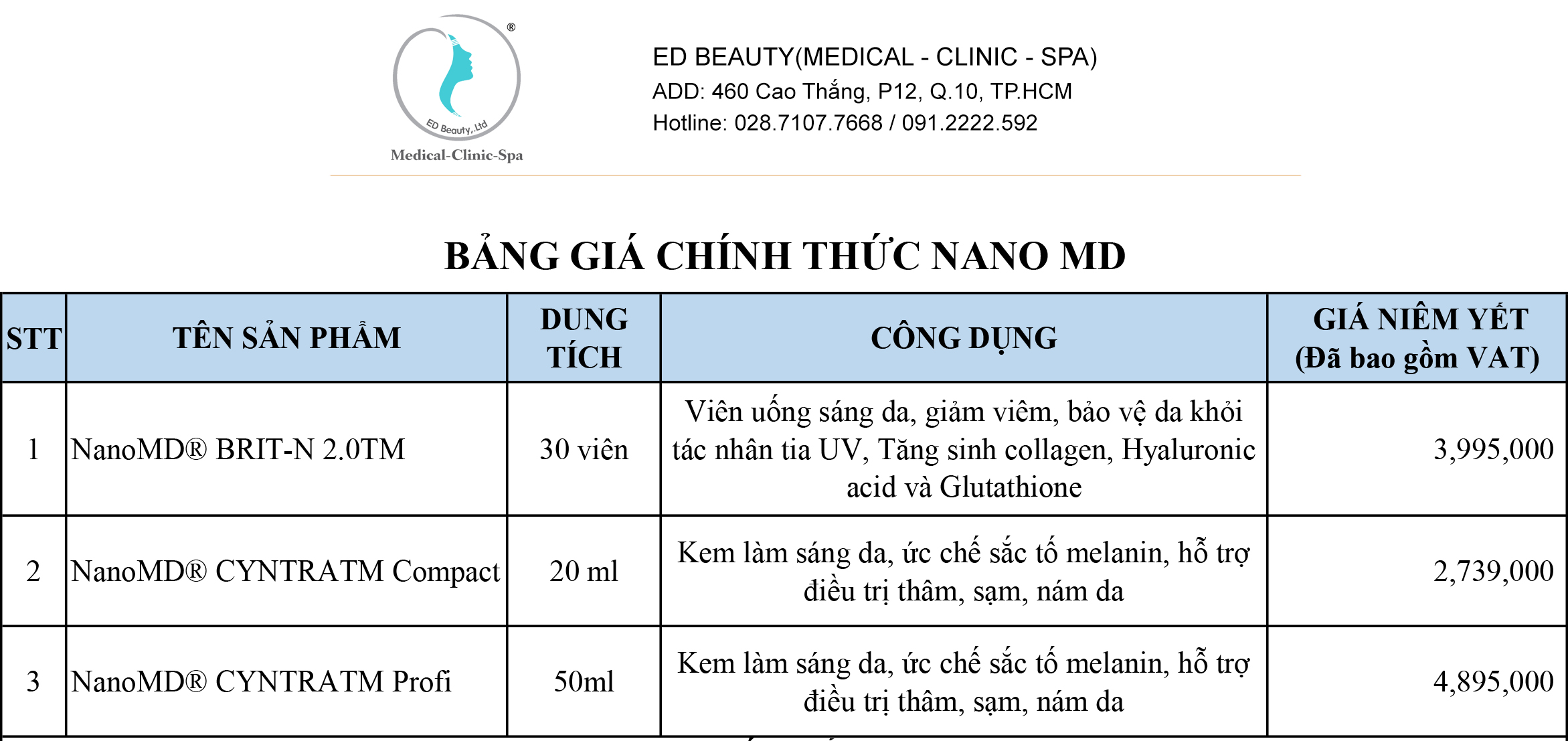 ED Beauty là đại lý chính thức của thương hiệu Nano MD tại Việt Nam. Bạn có thể yên tâm mua hàng Nano MD chính hãng tại công ty chúng tôi. Chúng tôi giới thiệu bảng giá bán lẻ Dược mỹ phẩm Nano MD chính hãng. Hy vọng khách hàng nắm bắt rõ mức giá thị trường, tránh được các tình huống báo giá sai hoặc ép giá. Tham khảo bảng giá sản phẩm Nano MD ngay sau đây: