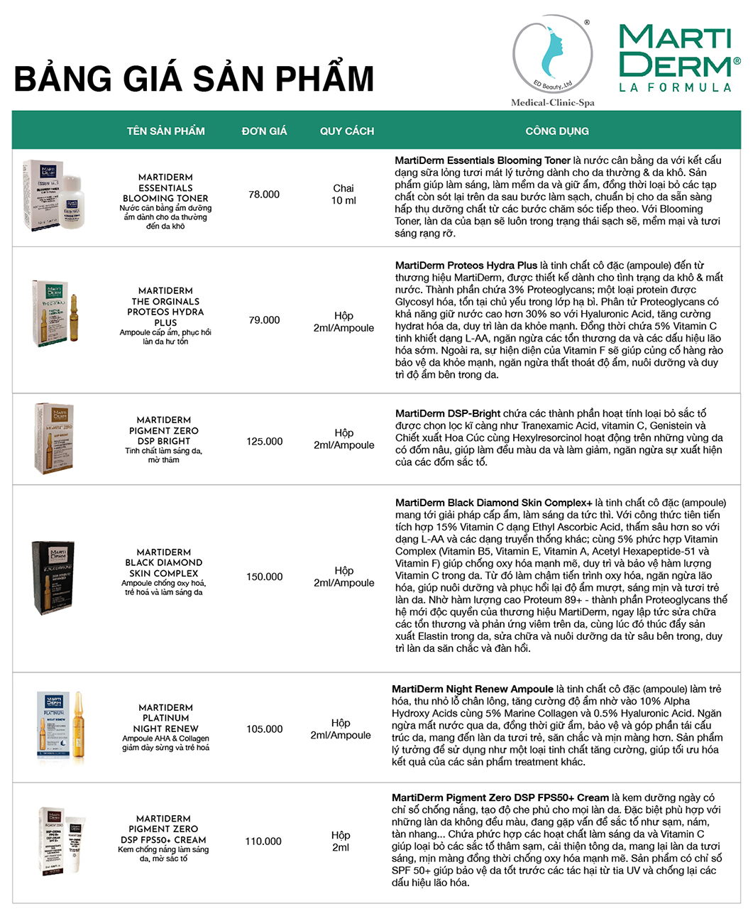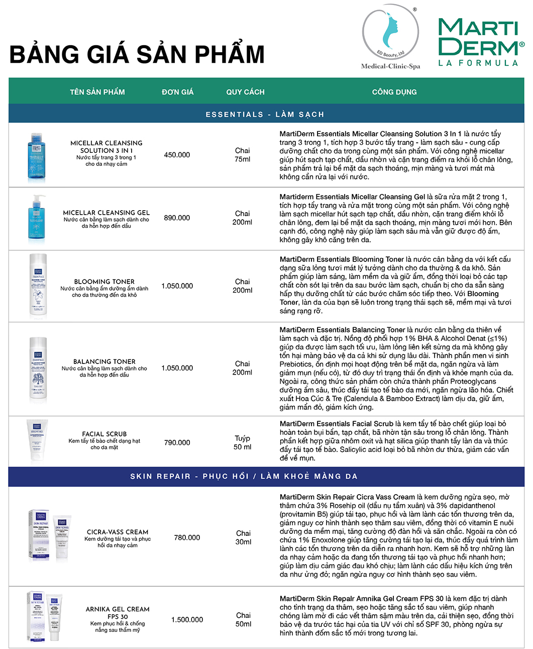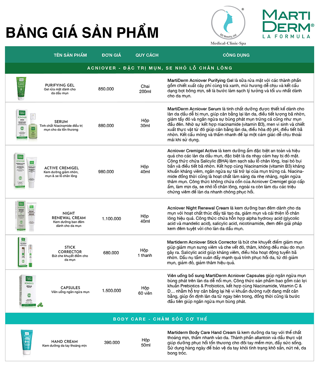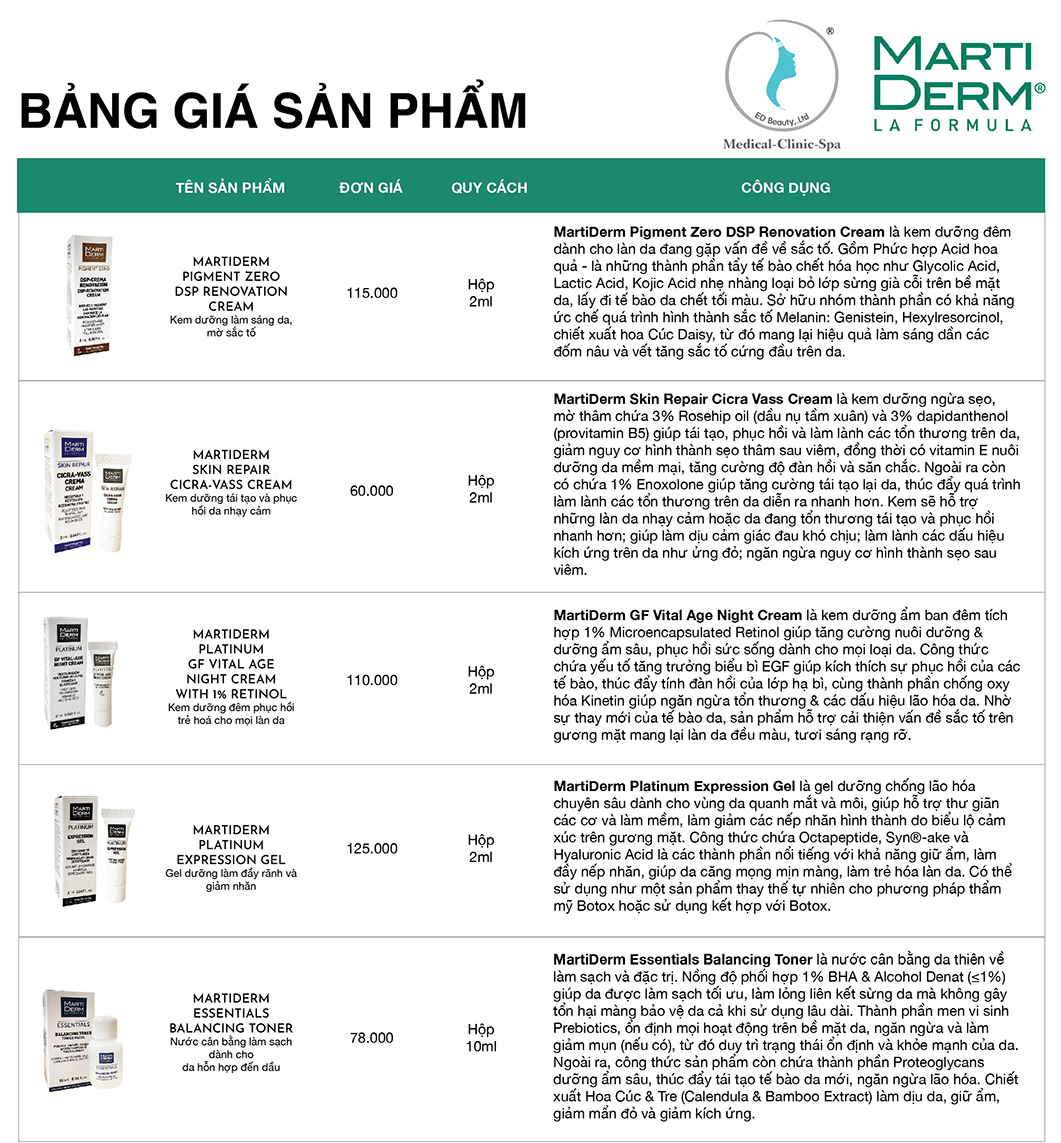 Hiểu được nhu cầu tìm kiếm các sản phẩm MartiDerm, chúng tôi trân trọng gửi đến Quý khách hàng Bảng giá Dược Mỹ phẩm MartiDerm tại Việt Nam. Chúng tôi hy vọng có thể giúp Quý khách mua được sản phẩm chính hãng chất lượng, giá cả chuẩn. Tránh được tình trạng mua phải hàng kém chất lượng, bị sai giá, ép giá. Cùng theo dõi thông tin bảng giá sản phẩm MartiDerm tại Việt Nam ngay sau đây: