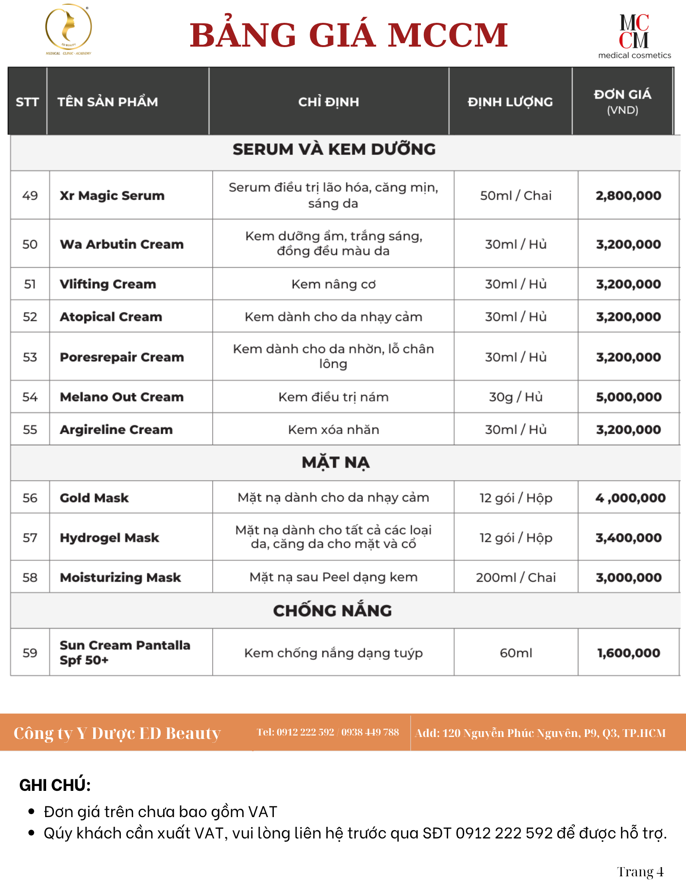 ED Beauty thông báo bảng giá dược mỹ phẩm MCCM chính thức ngay sau đây: