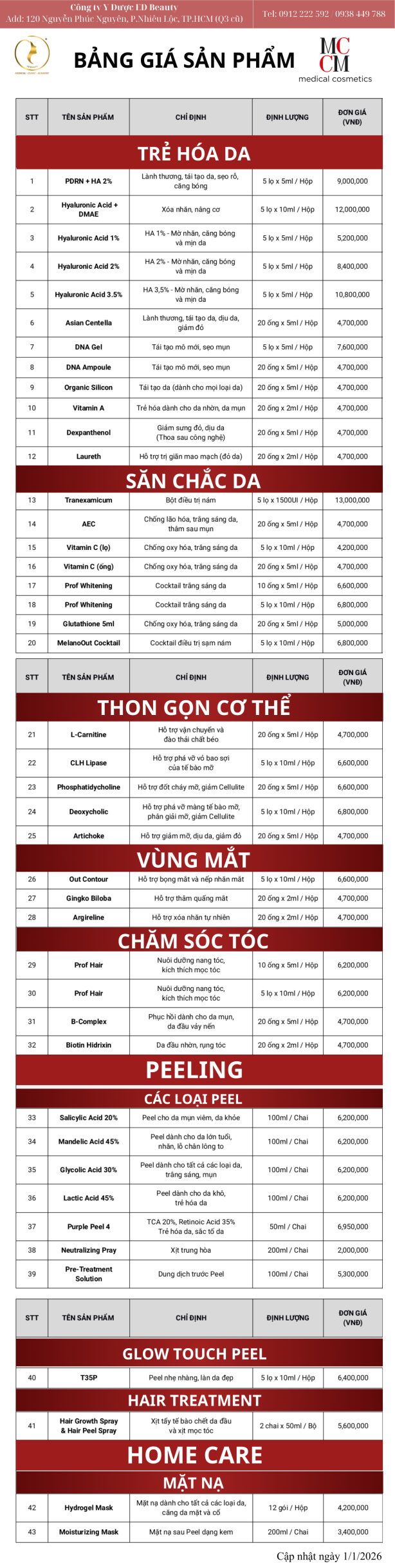 ED Beauty thông báo bảng giá dược mỹ phẩm MCCM chính thức ngay sau đây: