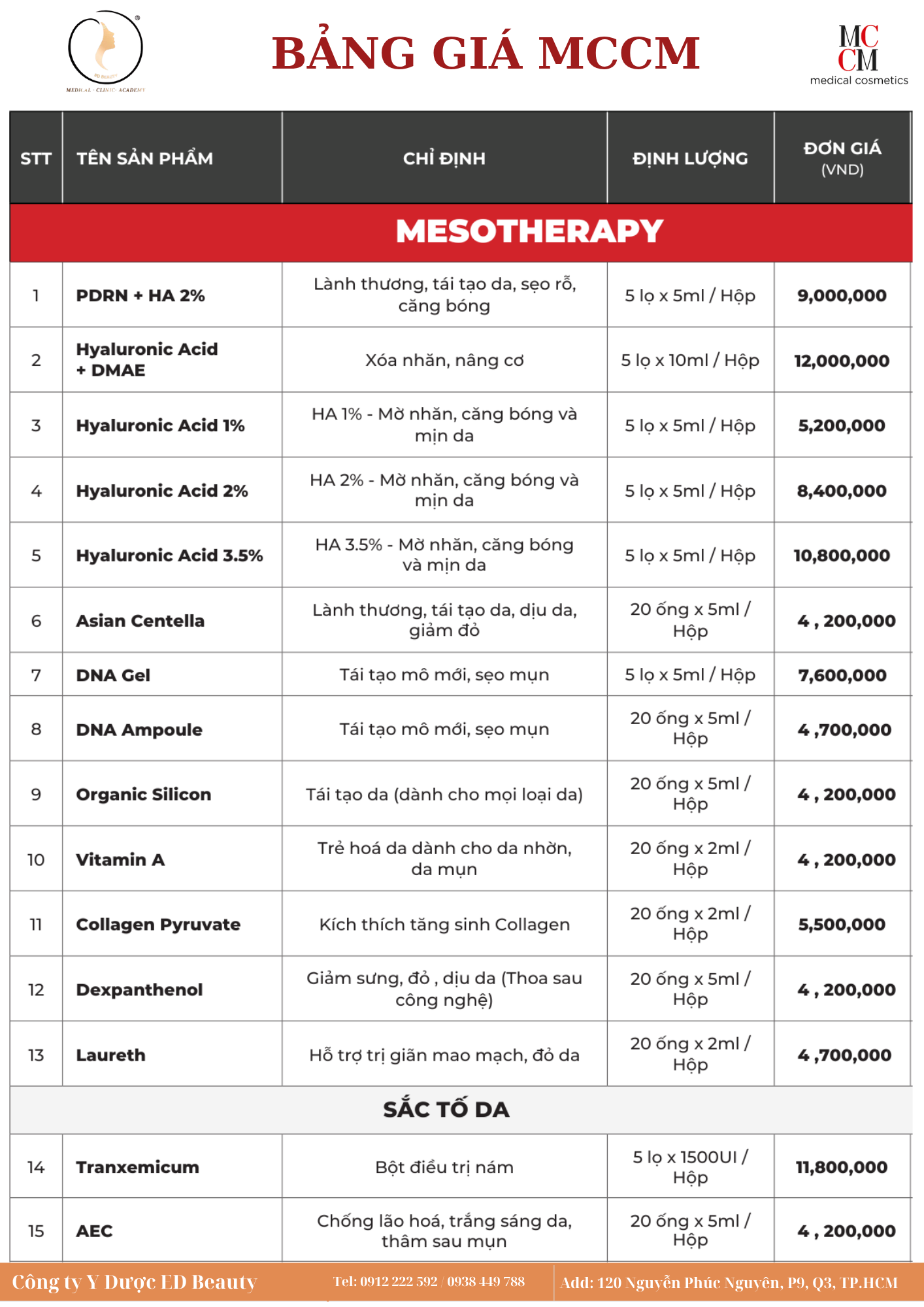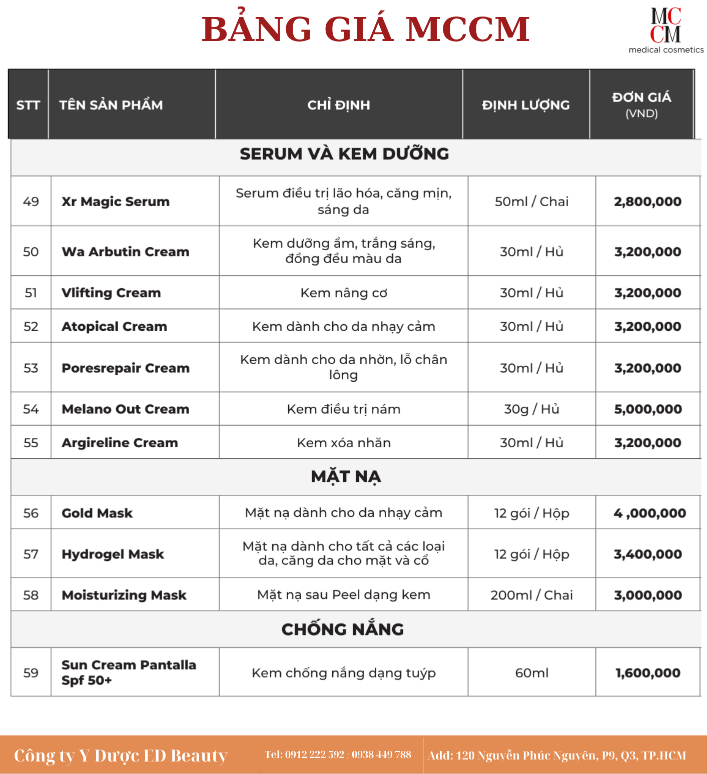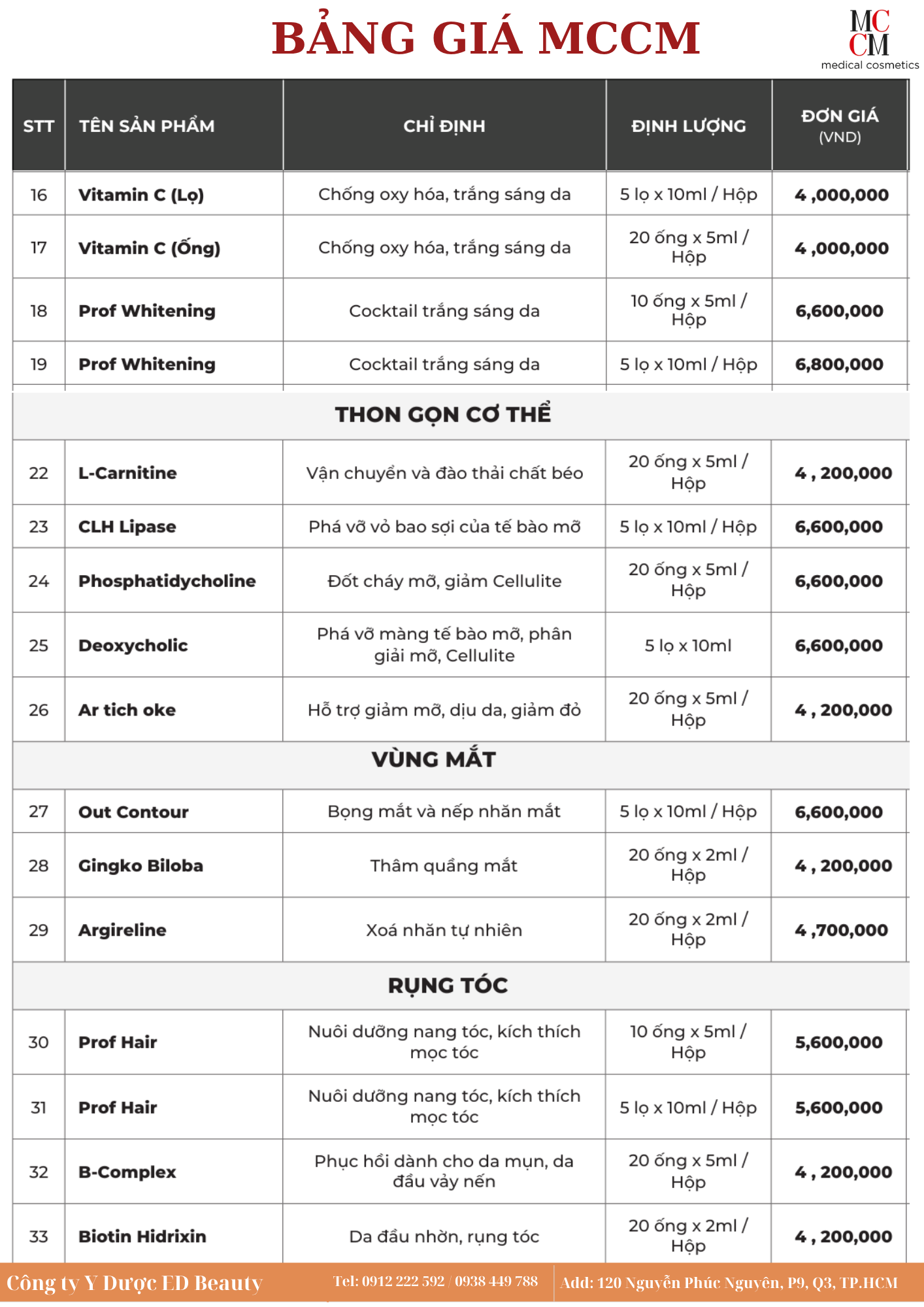 Kính gửi quý khách hàng, Ed Beauty xin gửi đến quý khách hàng bản cập nhật Bảng giá Dược Mỹ phẩm MCCM mới nhất. Với cam kết mang đến cho khách hàng những sản phẩm chính hãng và chất lượng vượt trội từ thương hiệu MCCM, Ed Beauty hy vọng sẽ trở thành người bạn đồng hành tin cậy trong hành trình làm đẹp của quý khách hàng.