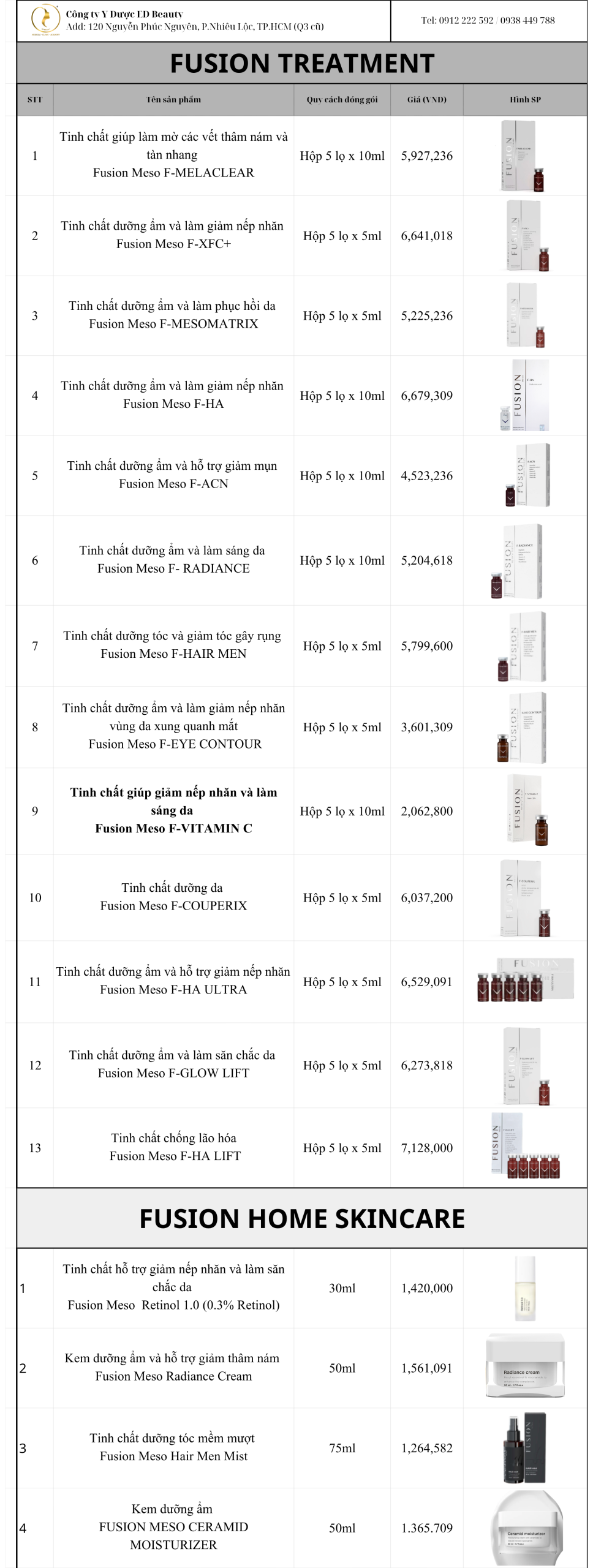 Fusion Meso là thương hiệu dược mỹ phẩm Tây Ban Nha nhận được nhiều phản hồi tích cực từ phía khách hàng. Dòng điều trị chuyên nghiệp Fusion Meso thực hiện bằng những liệu pháp điều trị như lăn kim, phi kim, tiêm và rất nhiều công nghệ cao khác. Thậm chí, một số sản phẩm có thể sử dụng theo hình thức bôi thoa tại nhà. Chính là giải pháp điều trị chuyên sâu các vấn đề da như tăng sắc tố, mụn, lão hóa, nếp nhăn, béo bụng… ED Beauty thông báo bảng giá mới của dòng sản phẩm Fusion Meso giúp quý khách hàng nắm bắt thông tin chính xác.