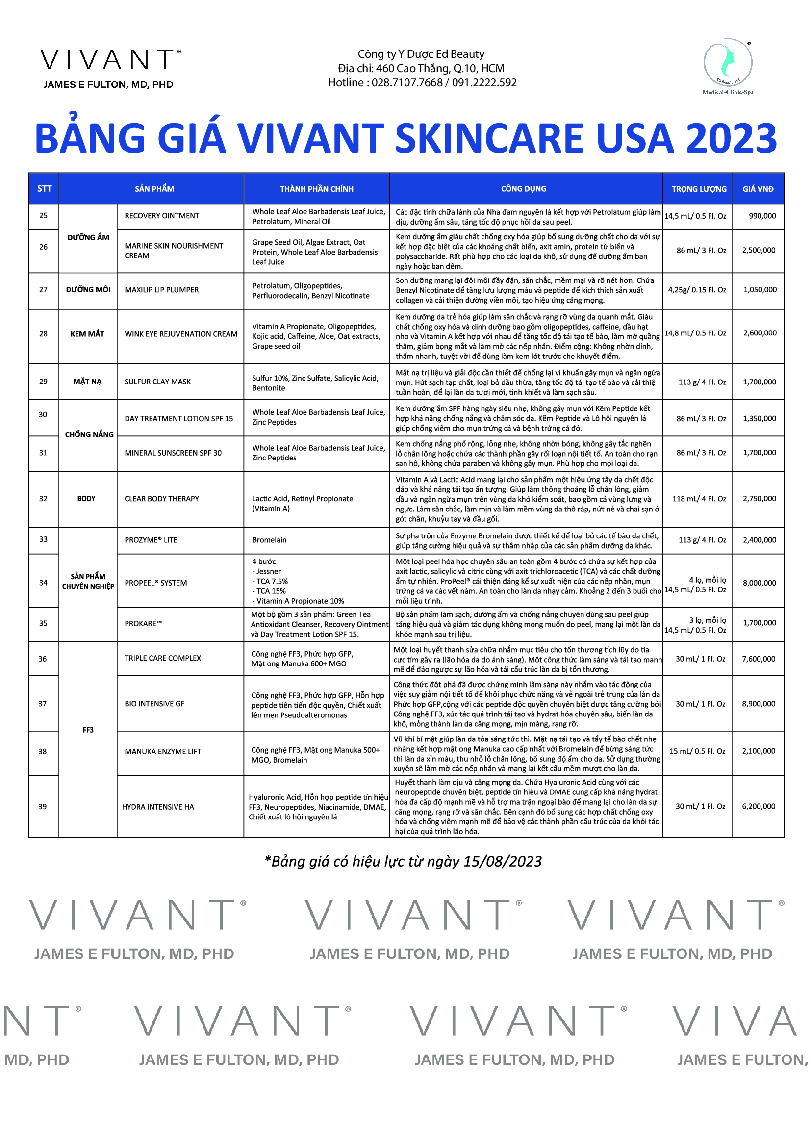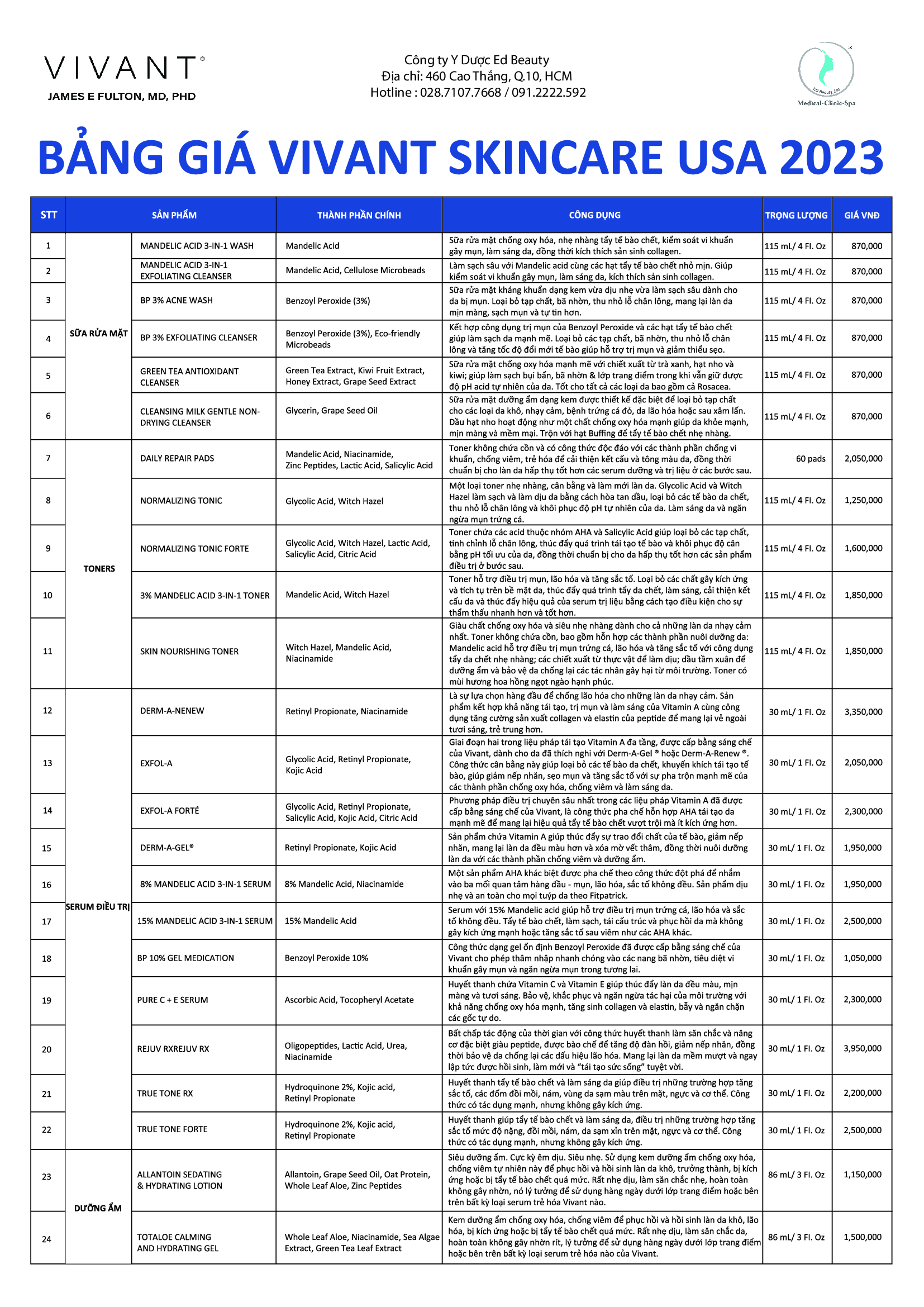 Bảng giá mỹ phẩm Vivant Skincare mới nhất