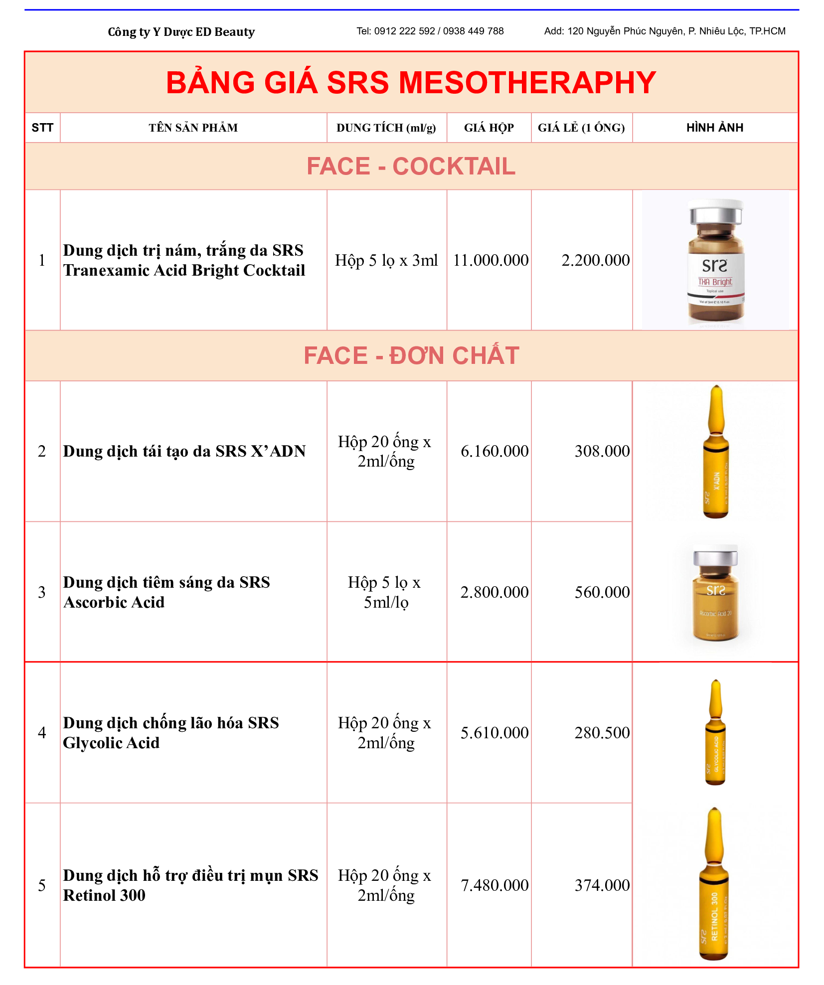 Cập nhật được xu hướng làm đẹp của khách hàng, ED Beauty trân trọng thông báo bảng giá sản phẩm Mesotherapy SRS đến từ Bỉ cụ thể như sau: