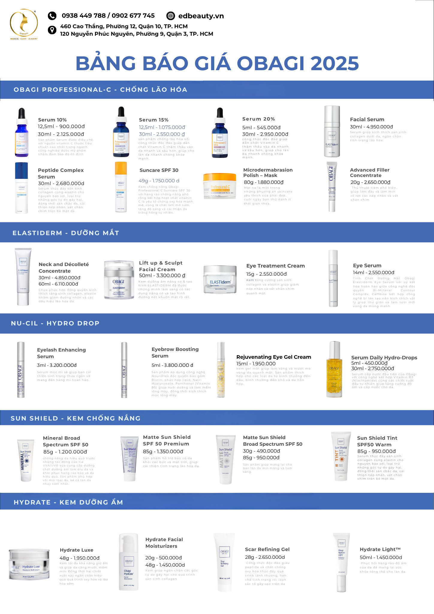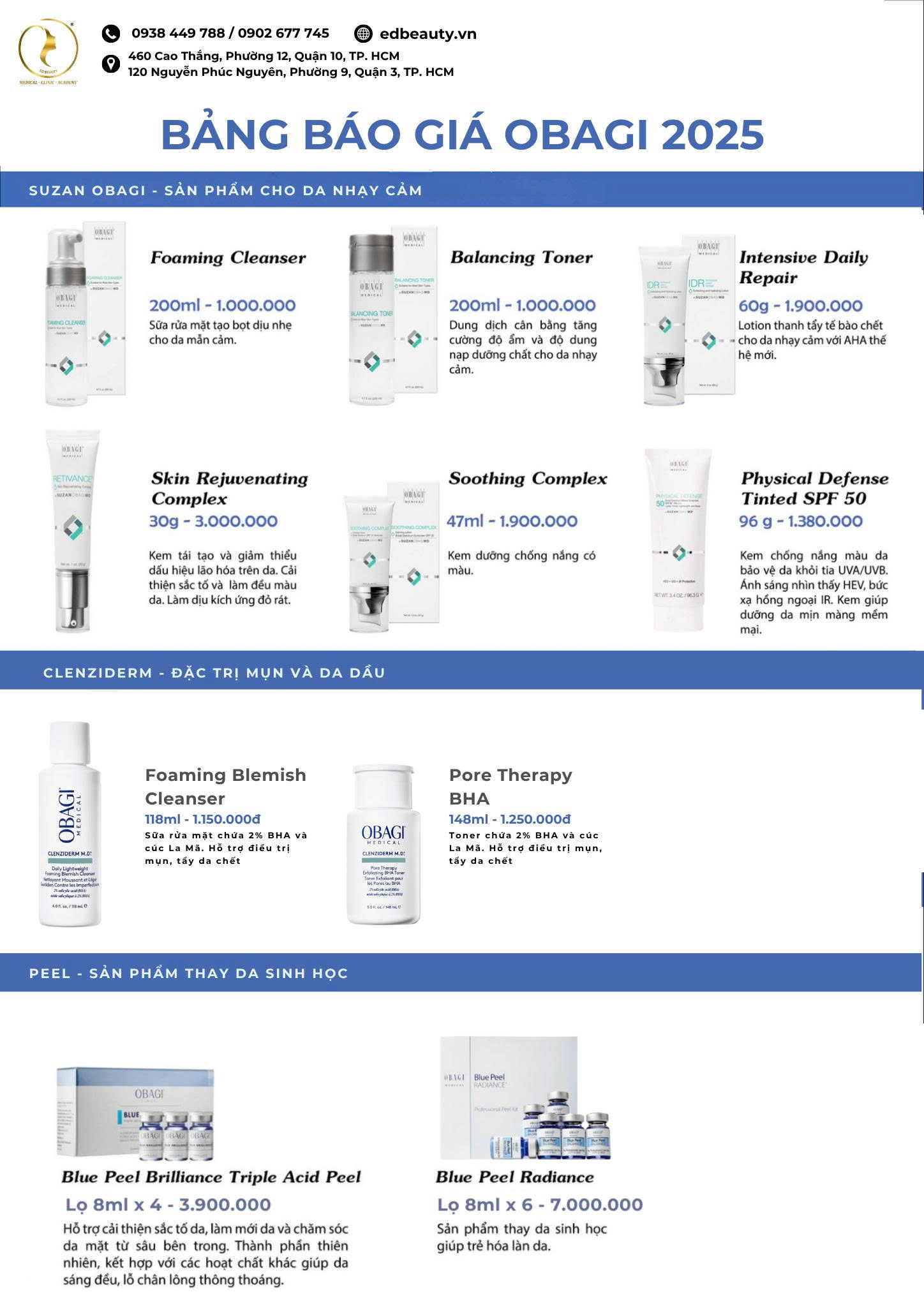 Bạn đang tìm kiếm sản phẩm Obagi chính hãng tại Việt Nam? ED Beauty cung cấp sản phẩm Obagi chính hãng nhập khẩu trực tiếp từ Mỹ. Bạn hoàn toàn an tâm khi mua hàng tại ED với chất lượng tốt và mức giá chuẩn. Hỗ trợ quý khách hàng dễ lựa chọn và cập nhật giá cả sản phẩm khi mua hàng, ED cung cấp bảng giá sản phẩm Obagi chính hãng tại Việt Nam như sau: