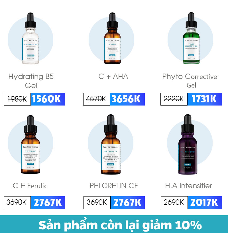 - GIẢM 25%: C E Ferulic, Phloretin CF, H.A Intensifier, Discoloration Defense, Blemish + AGE Defense