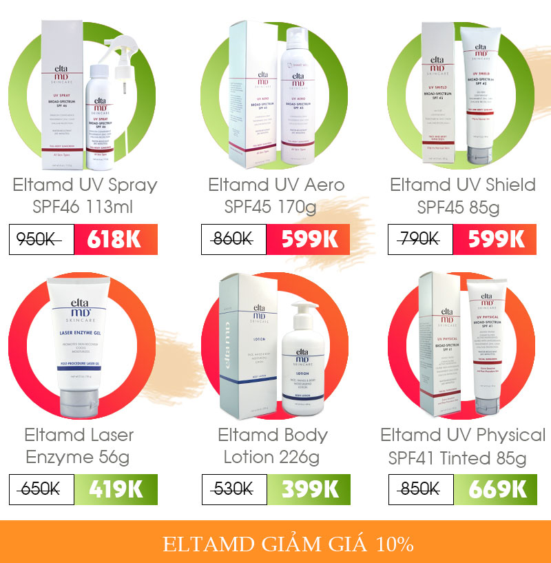 – Kem chống nắng dạng dược EltaMD giảm giá 10% . Đối với các sản phẩm dưới đây được giảm từ 15 đến 35%