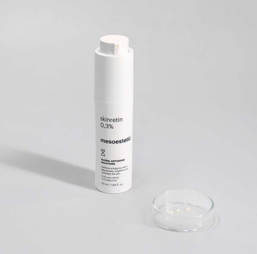 Skinretin 0,3% là kem có chứa retinol để sử dụng tại nhà của mesoestetic kết hợp 0,3% retinol nguyên chất và 0,7% bakuchiol trong công thức. Tác dụng chống lão hóa của retinol được tăng cường bằng cách kết hợp retinol với bakuchiol, một hoạt chất có nguồn gốc thực vật tự nhiên có ưu điểm là phù hợp với làn da nhạy cảm. Mức nồng độ retinol tối ưu này là điểm khác biệt giữa Skinretin 0,3% với các loại kem dưỡng có chứa retinol khác và khiến nó trở nên lý tưởng để điều trị các dấu hiệu lão hóa khác nhau.