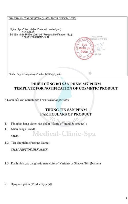 Hình ảnh giấy công bố sản phẩm mặt nạ SMAS như sau: