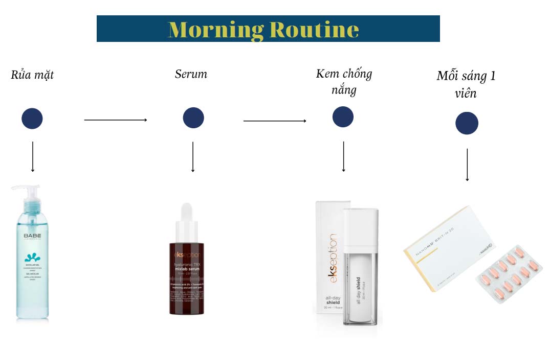 - Vệ sinh da: Tẩy trang —> Rửa mặt —> Toner