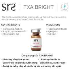SRS TXA Bright là dung dịch có công thức trị nám, tàn nhang, hỗ trợ điều trị hiệu quả các đốm đen/nâu do tăng sắc tố nhờ đặc tính chống oxy hóa mạnh và khả năng ức chế sản xuất melanin. Cô đặc chất chống oxy hóa mạnh này giúp làm sáng, sửa chữa, phục hồi vẻ rạng rỡ và bảo vệ da, phù hợp điều trị các vấn đề da như lão hóa, nám tàn nhang, da xỉn màu, không đồng đều màu.