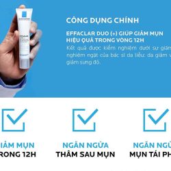 La Roche Posay Effaclar Duo với 3 tác động: giảm mụn, ngừa thâm và ngăn ngừa mụn tái phát. Ngoài ra, Duo+ không làm khô da vì nó có chứa một lượng thành phần dưỡng ẩm đủ để da không bị bong tróc, khô căng, da vẫn rất mượt và mềm.