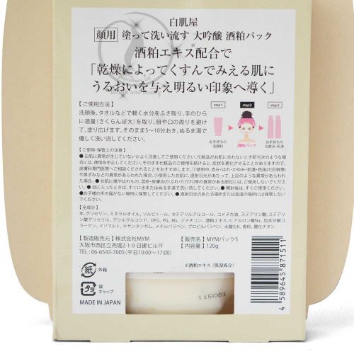 - Mặt nạ Sake Kasu Face Pack có thành phần từ bã rượu sake có khả năng loại bỏ lớp tế bào chết già nua, sậm màu; cùng với đó thành phẩn chiết xuất từ dưa chuột, trái yuzu và cám gạo lên men có công dụng dưỡng ẩm và làm sáng da.