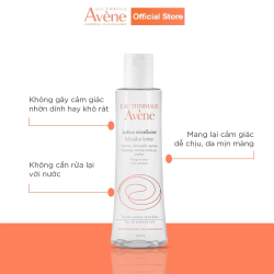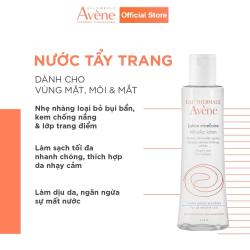 Nước tẩy trang Micellar Lotion 200ml dành cho da nhạy cảm giàu nước khoáng Avène nên rất hiệu quả trong việc làm dịu làn da đang bị khó chịu, căng kéo, ửng đỏ. Hơn nữa, lotion chứa tác nhân làm sạch êm dịu, giúp loại bỏ bụi bẩn nhẹ nhàng và tẩy trang cho mặt, mắt, môi mà không làm ảnh hưởng đến sự cân bằng tự nhiên của làn da.