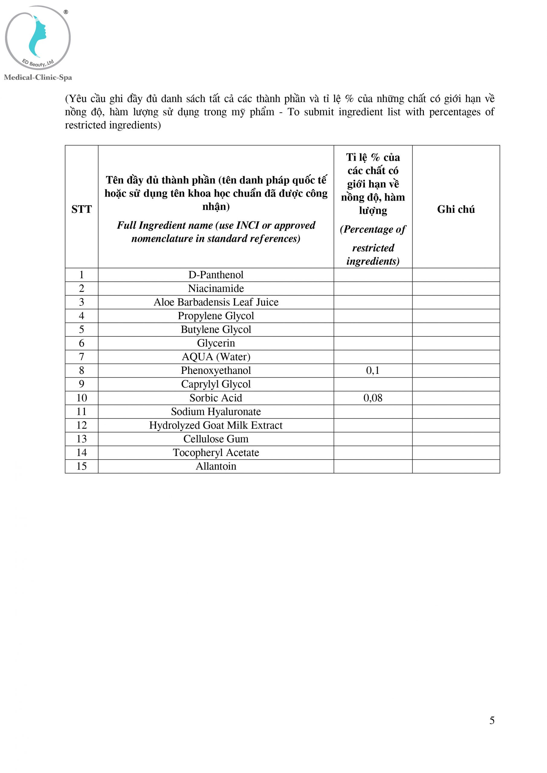 - Allantoin: Giúp tái tạo da và cải thiện tình trạng da hư tổn bề mặt. Làm dịu da kích ứng, giảm mẫn đỏ.