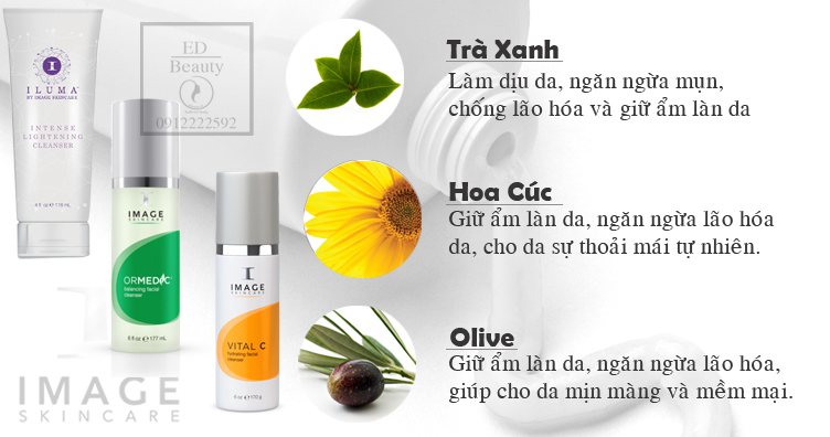 Đặc biệt sữa rửa mặt Image Skincare còn có chiết xuất từ tinh chất trà xanh, hoa cúc, nha đam, dầu olive, yến mạch giúp cung cấp dưỡng chất thẩm thấu sâu vào da, làm dịu da, làm mờ thâm sạm, cho làn da tươi sáng