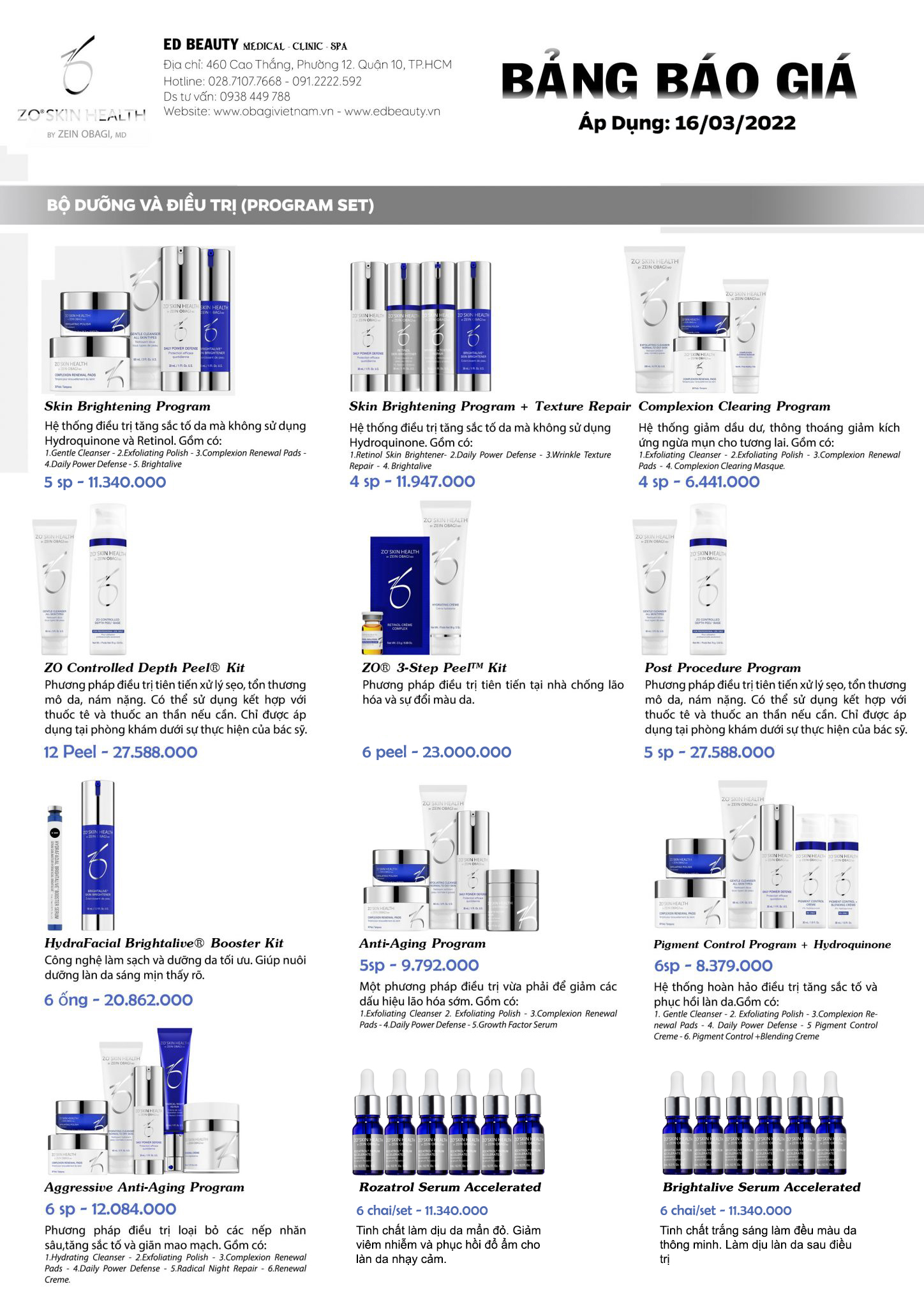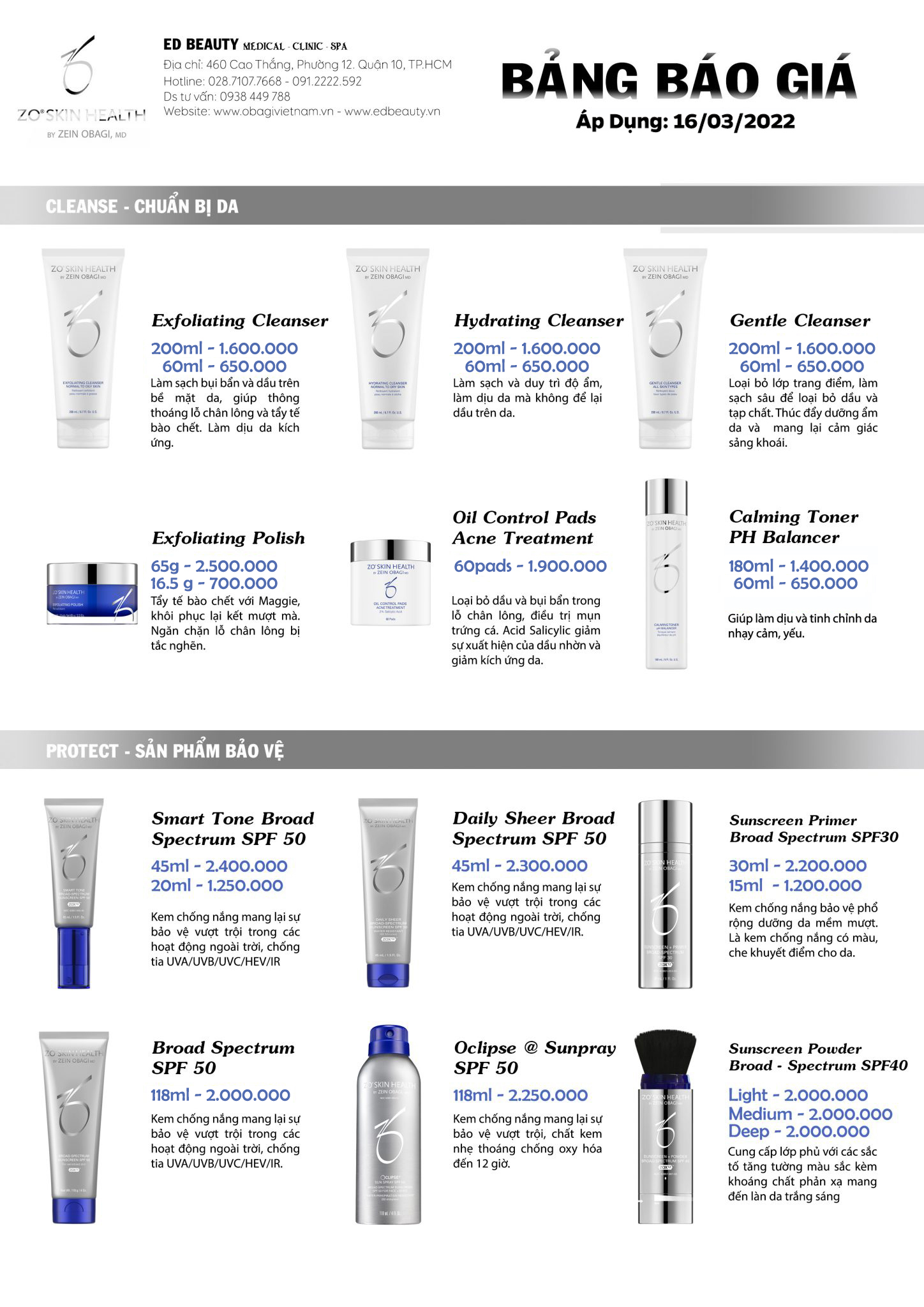 Chúng tôi chân thành cảm ơn Quý khách hàng đã luôn tin tưởng và ủng hộ sản phẩm của ED Beauty trong thời gian qua. Sau khi nhận được thông báo chính thức từ hãng ZO Skin Health tại Hoa kỳ về việc tăng giá các sản phẩm của ZO Skin Health (Việc tăng giá này sẽ áp dụng đồng bộ toàn trên hệ thống). ED Beauty xin gửi đến Quý khách bảng giá mới như sau: