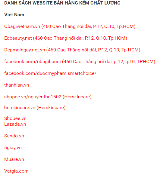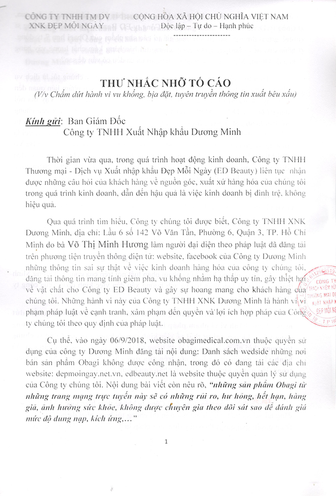 Cụ thể, vào ngày 06/9/2018, website obagimedical.com.vn thuộc quyền sử dụng của công ty Dương Minh đăng tải nội dung: Danh sách wedside những nơi bán sản phẩm Obagi không được công nhận, trong đó có đang tải các địa chỉ website: depmoingay.net.vn, edbeauty.net là website thuộc quyền quản lý sử dụng của Công ty chúng tôi. Nội dung bài viết còn nêu rõ, “những sản phẩm Obagi từ những trang mạng trực tuyến này sẽ có những rủi ro, hư hỏng, hết hạn, hàng giả, ảnh hưởng sức khỏe, không được chuyên gia theo dõi sát sao để đánh giá mức độ dung nạp, kích ứng,…”
